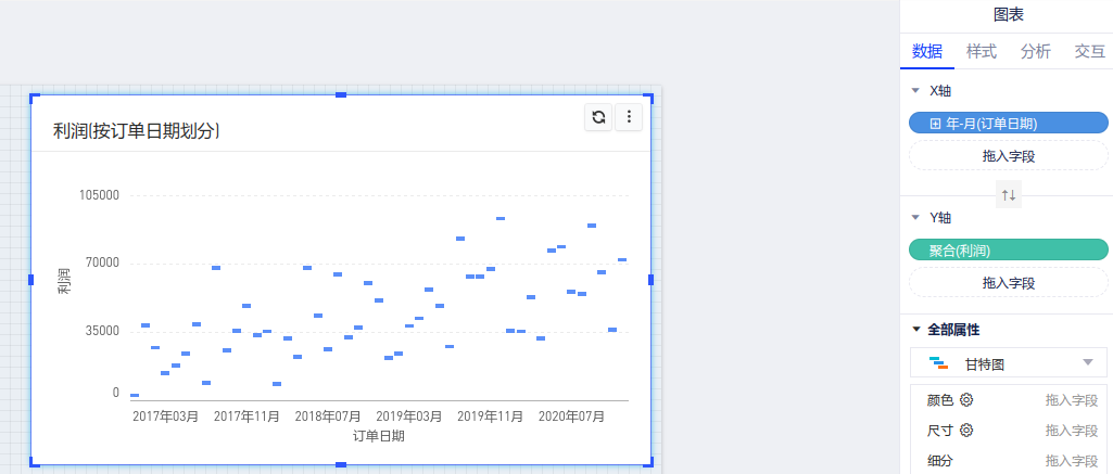 (2)将维度【订单日期】、度量【利润】分别拖入x轴和y轴;并将【订单日期】的日期类型改为“年-月”;