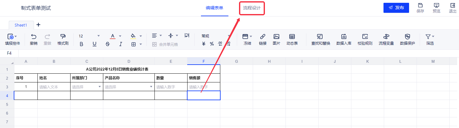 (1)您在完成表单编辑后,点击顶部[流程设计]按钮即可进入该表单的流程配置页面