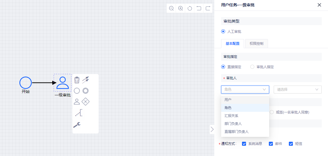 - 用户任务:需要用户完成操作的节点,如审批、编辑;可添加多个,节点间通过线路连接
