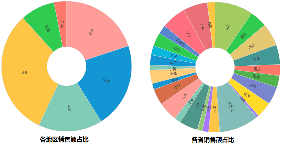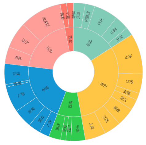 组合在一起以旭日图展示数据,不仅可以直观看到各地区销售额占比、各省销售额占比,还能看到地区跟省的层级对应关系。那么该如何绘制旭日图呢?