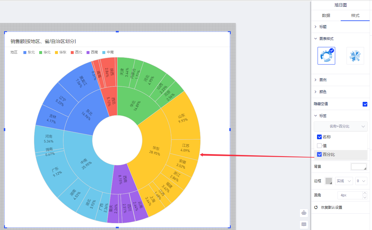 (3)可以在样式面板里对旭日图做一些样式上的调整,如标签显示百分比,更改图表样式等。