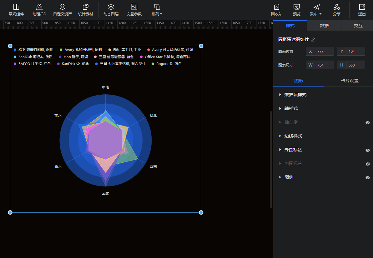 在编辑状态下点击圆形雷达图组件即可对其进行配置,配置内容分为样式、数据和交互三个Tab。(本节仅介绍圆形雷达图特有属性的配置,基础图表共性的配置请参考下文"组件配置")