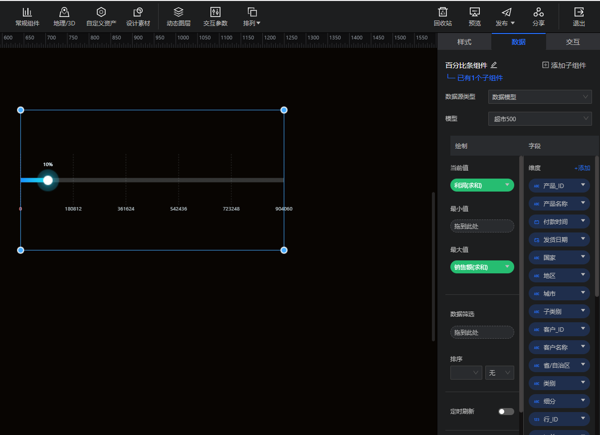 - 最大值:设置百分比条的最大值,为度量字段,如下图所示为“销售额”。