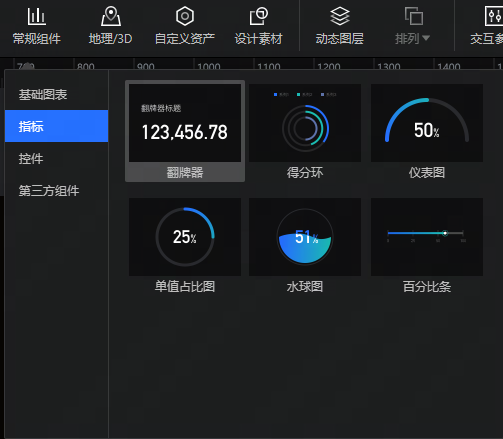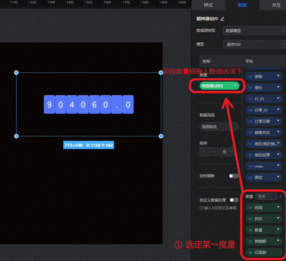 翻牌器的数据配置:翻牌器的作用是显示某一度量的数值,当用户将数据Tab下的某一度量值拖入到翻牌器的数值选项下时,翻牌器即可显现其数值。