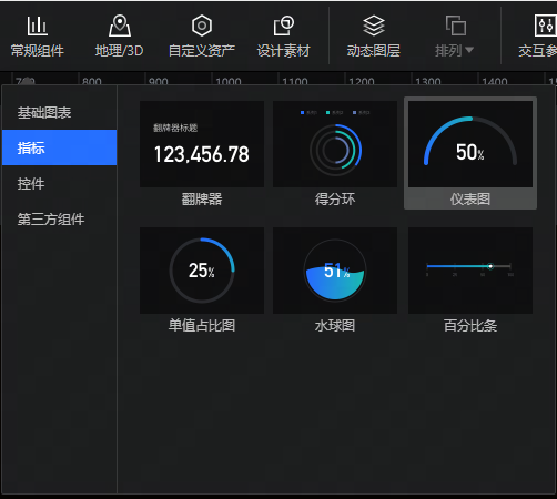 在编辑状态下点击仪表图组件即可对其进行配置,配置内容分为样式、数据和交互三个Tab。