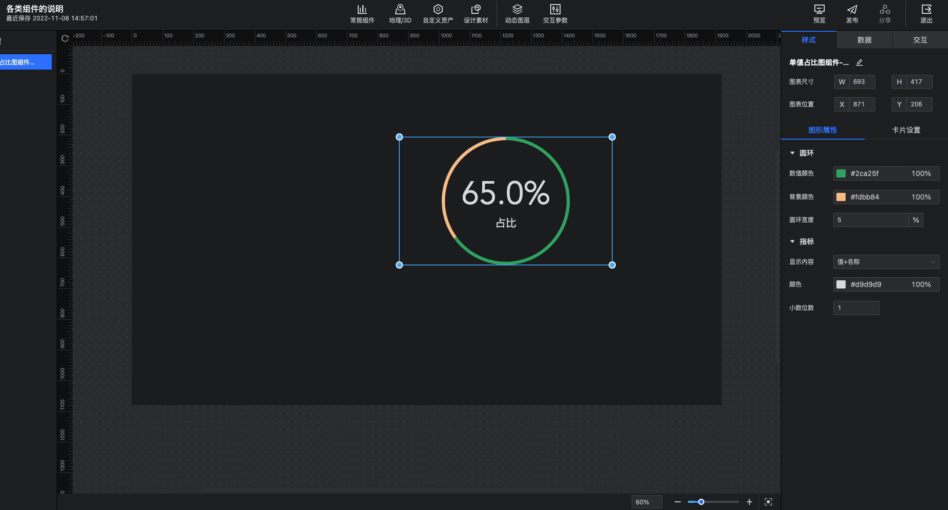 单值占比图的样式配置:分为图形属性、卡片设置两个子Tab,用户可以在这此调整颜色、字体、大小等。