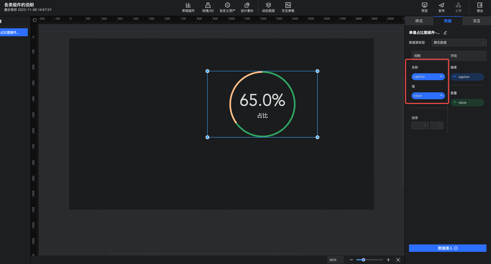 在编辑状态下点击单值占比图组件即可对其进行配置,配置内容分为样式、数据和交互三个Tab。