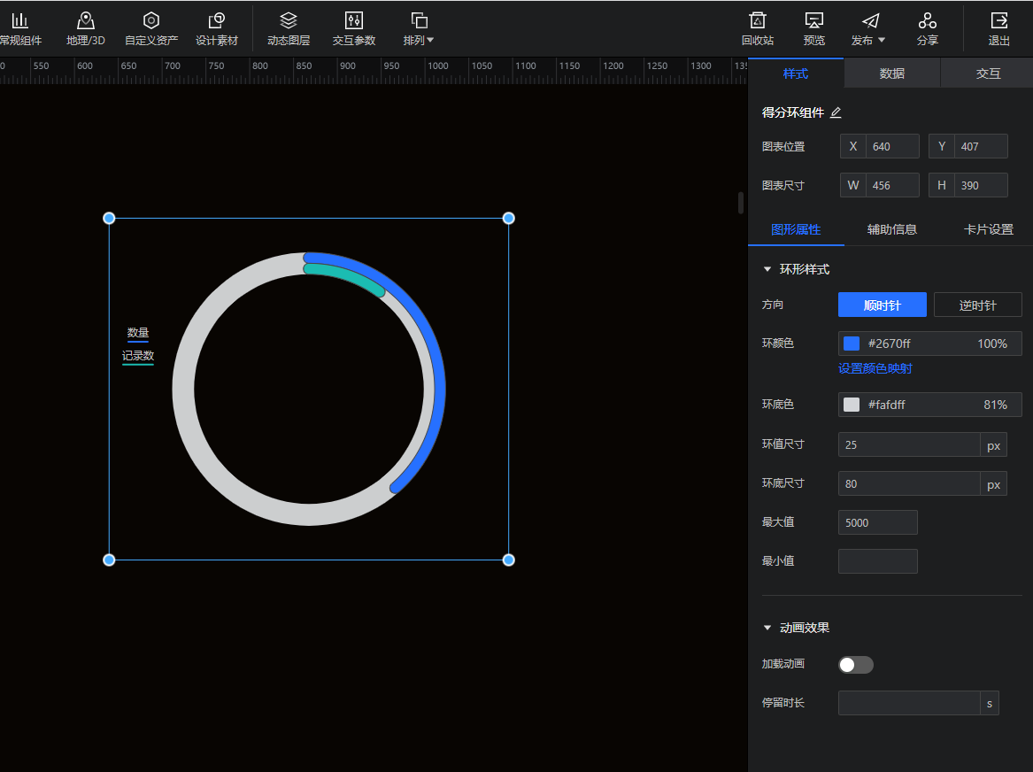 在编辑状态下点击得分环组件即可对其进行配置,配置内容分为样式、数据和交互三个Tab。