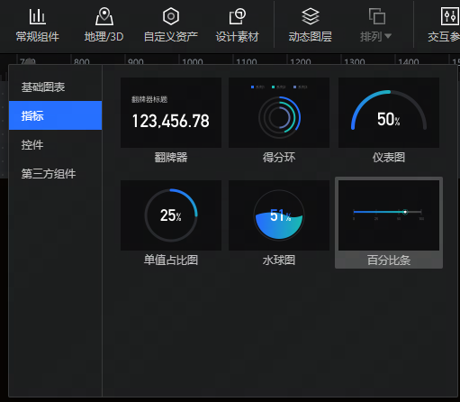 在编辑状态下点击百分比条组件即可对其进行配置,配置内容分为样式、数据和交互三个Tab。