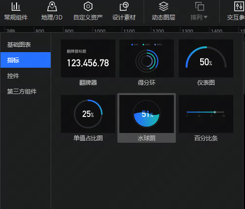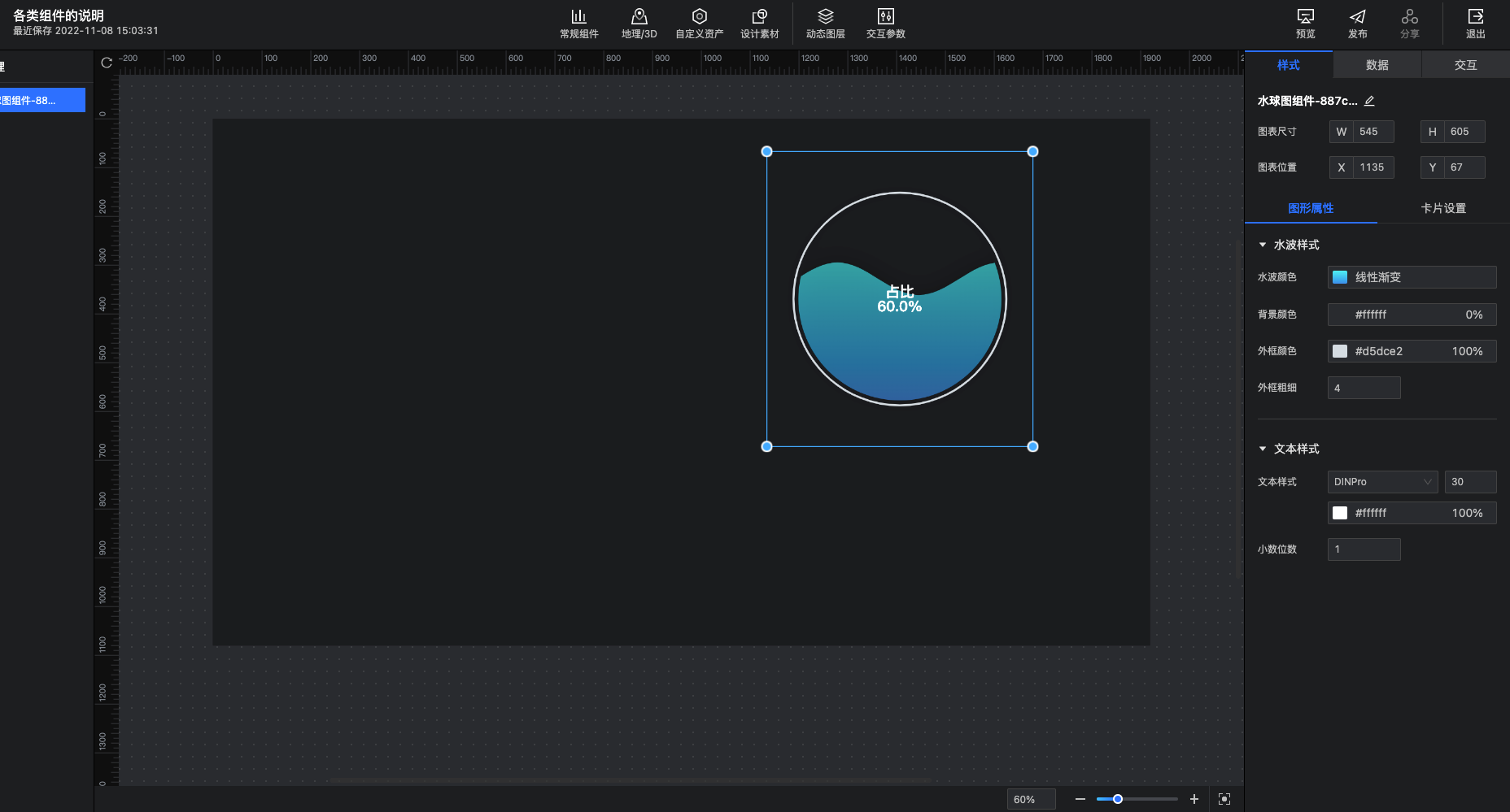 水球图的样式配置:分为图形属性、卡片设置两个子Tab,用户可以在这此调整颜色、字体、大小等。