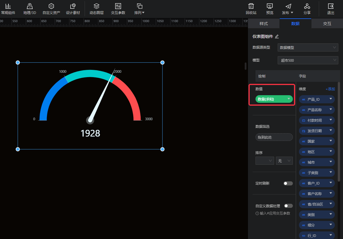 仪表图的数据配置:设置仪表图的度量字段,如下图所示为“数量”