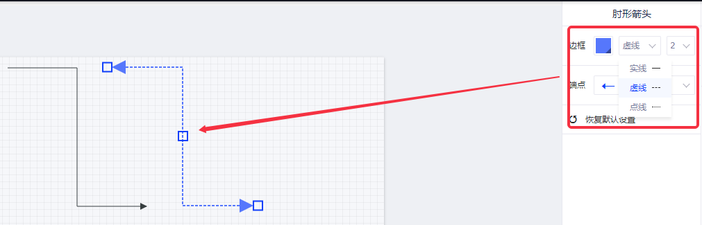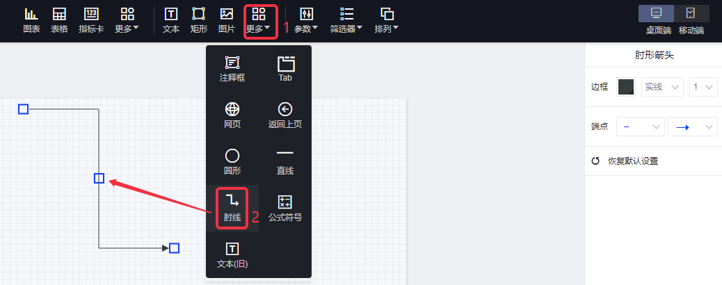 1.概述2. 快速入门1.概述作为常用的一种连接线,您可以使用肘线控件在报告中画肘线。 2. 快速入门(1)在画布上画出一个肘线控件; (2)您可任意调整肘线大小和角度,在右侧的设置面板中,可以修改肘线的颜色、粗细、左右端点箭头类型等;